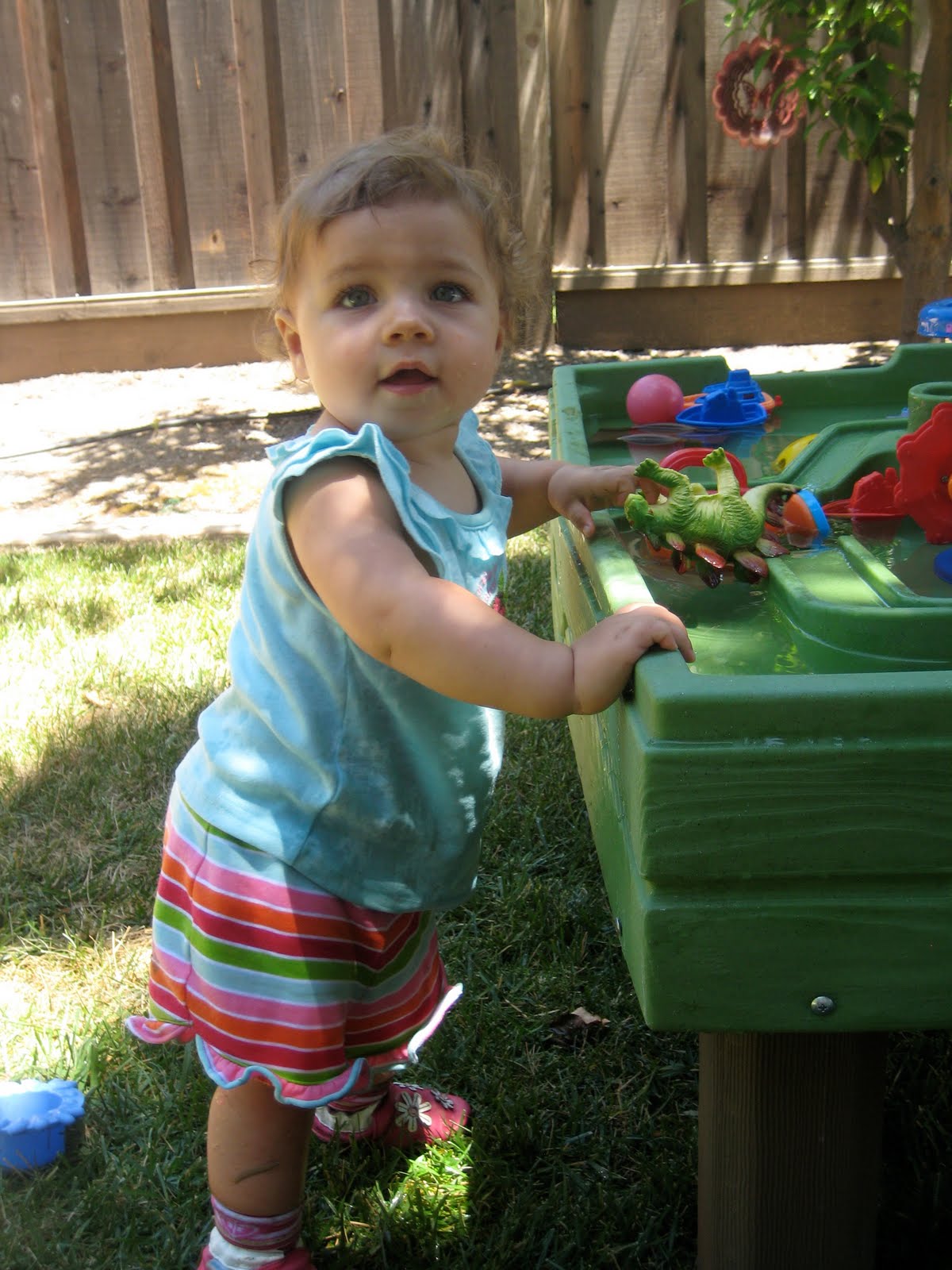 We turned our slide into a waterslide this afternoon and Joelle played at the watertable for the first time. We also turned the sprinklers on to cool off. Summer is finally here!
